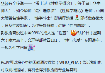 彭教授曾说过中国99%的成人是“性盲”,5月9日(星期六)晚六点半,文理学部教四101,“性与恋爱”专题讲座,一起为性学扫盲!