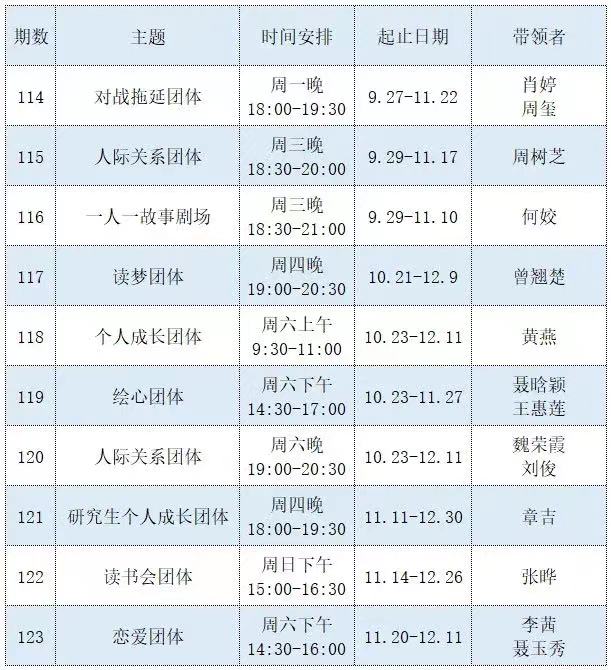 2.“光合作用”连续团体本学期分为三波,第一波团体114-116期,第二波团体117-120期,第三波团体121-123期,招募时间分别为九月中旬、十月上旬和十月下旬,为保证你在团体中更好地获益,建议不要同时报名多期连续团体,请根据实际需求及时关注你最想参与的团体招募信息。